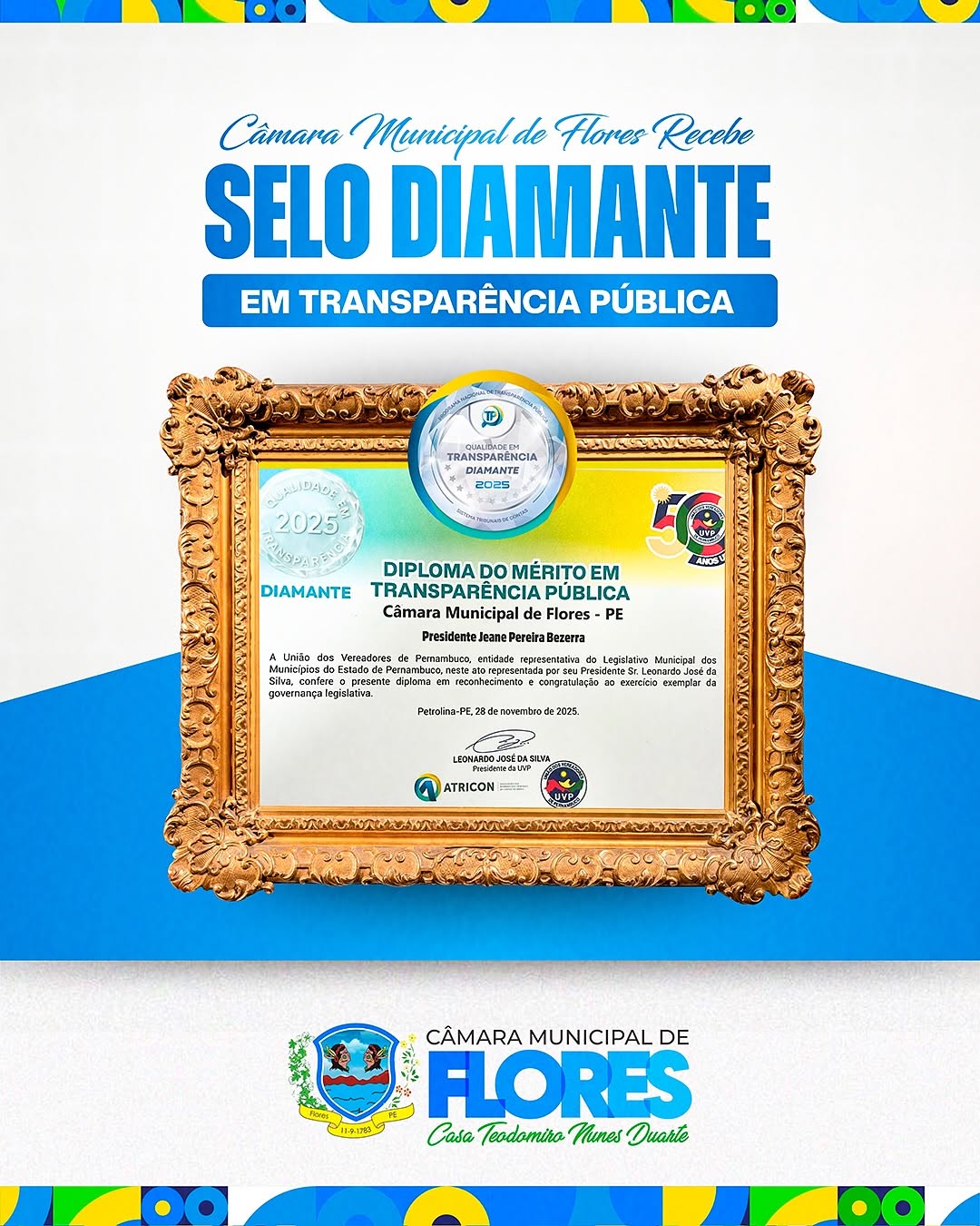 A Câmara Municipal de Flores tem a satisfação de informar que o certificado e o troféu do Selo Diamante da ATRICON já chegaram oficialmente à nossa Casa de Leis. Este reconhecimento, que representa o mais alto nível de excelência em transparência pública no Brasil, agora ganha forma física em nossas mãos — e simboliza um marco histórico para toda a população florense.
