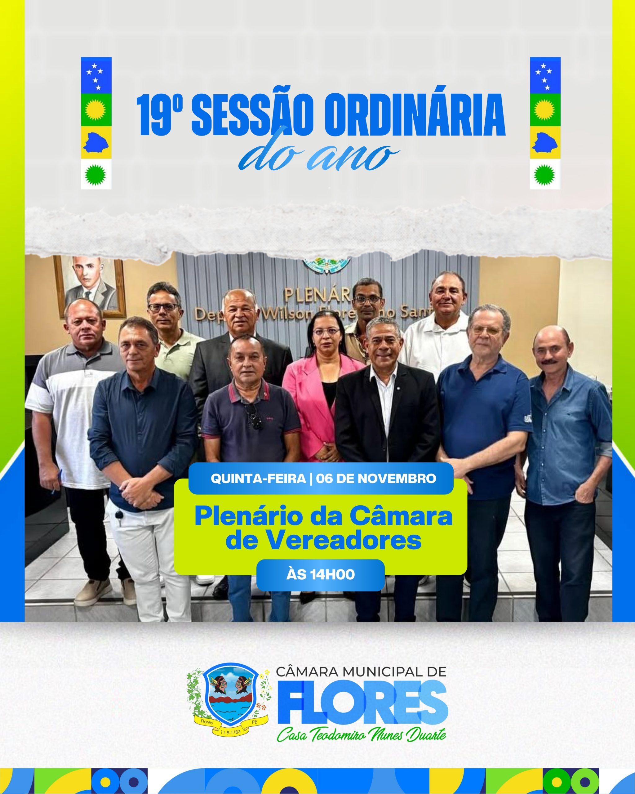 Nesta quinta-feira, 06 de novembro, a partir das 14h, acontecerá mais uma sessão no Plenário da Câmara de Vereadores de Flores, reunindo os parlamentares para debater temas importantes para o nosso município. 🏛️💬 Acompanhe de perto os trabalhos do Poder Legislativo Florense e veja de que forma a Câmara atua em prol da nossa gente!