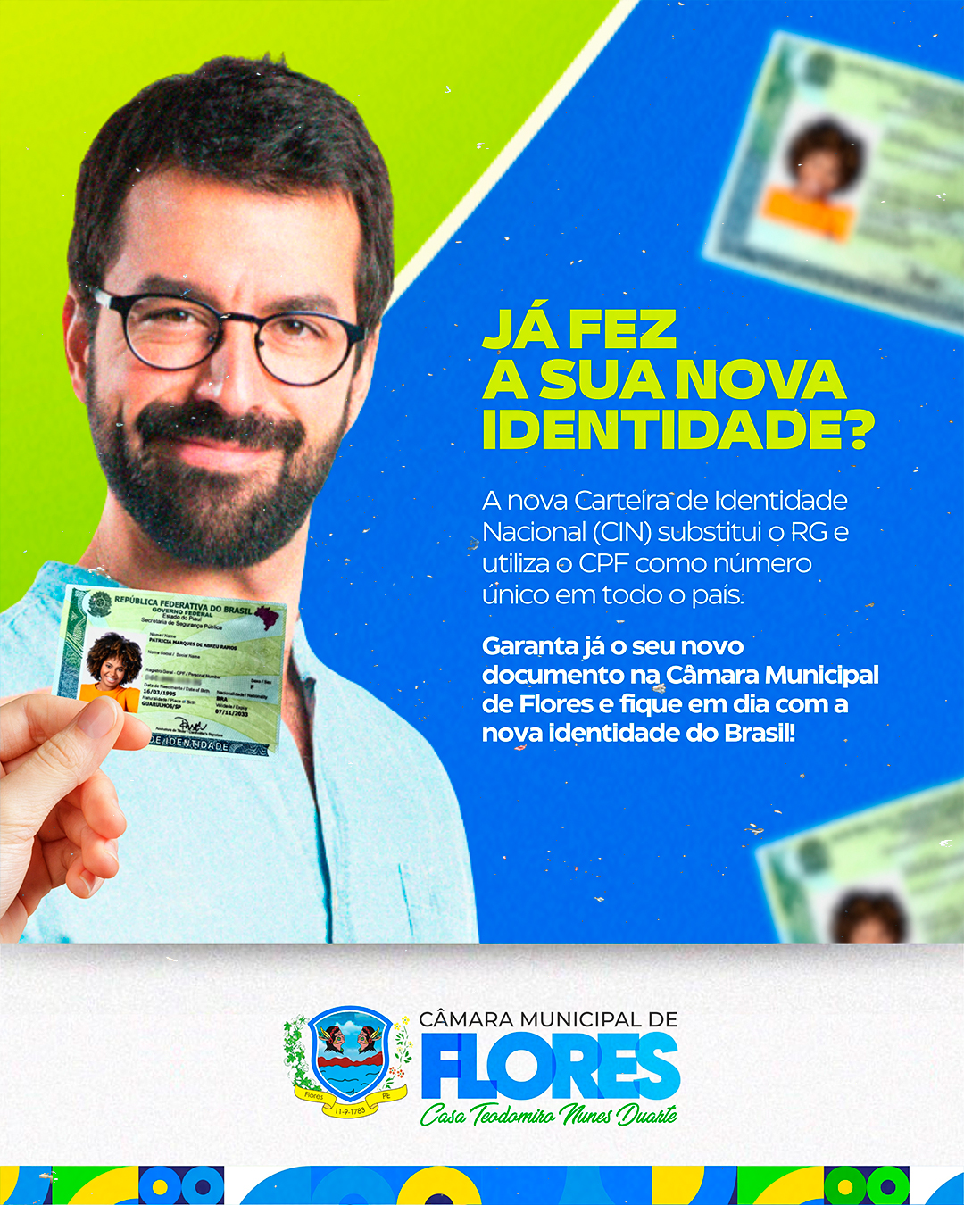 Já fez a sua nova identidade? Agora você pode tirar a Carteira de Identidade Nacional (CIN) diretamente na Câmara Municipal de Flores! 💳💙 A nova CIN substitui o RG e usa o CPF como número único em todo o país. 📍 Procure a Câmara e garanta o seu novo documento!
