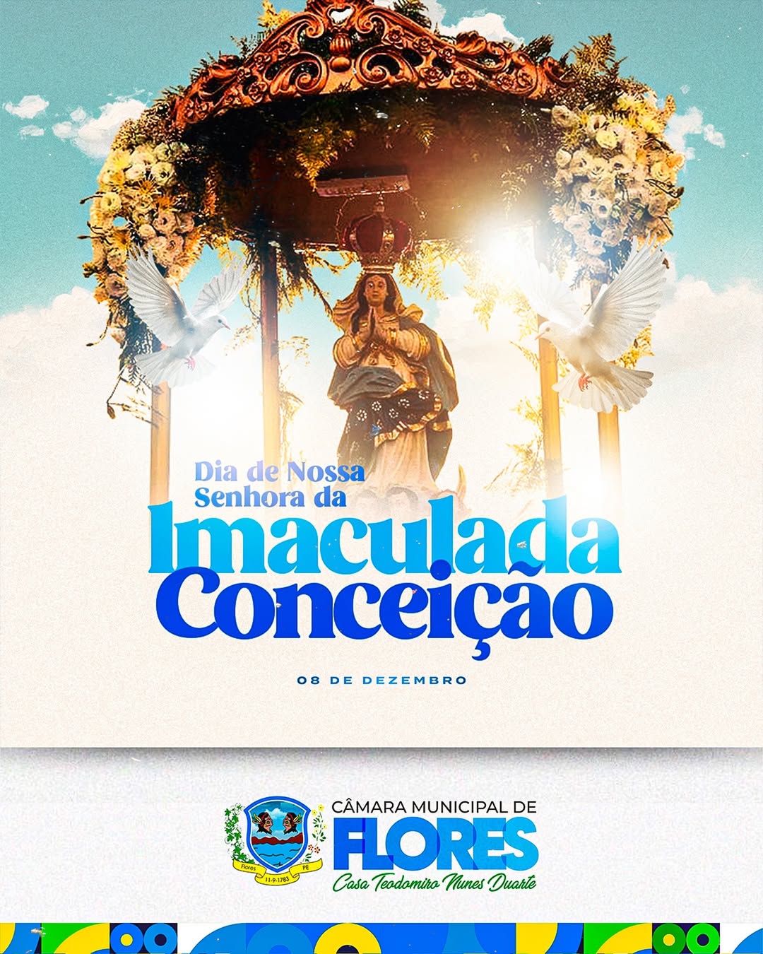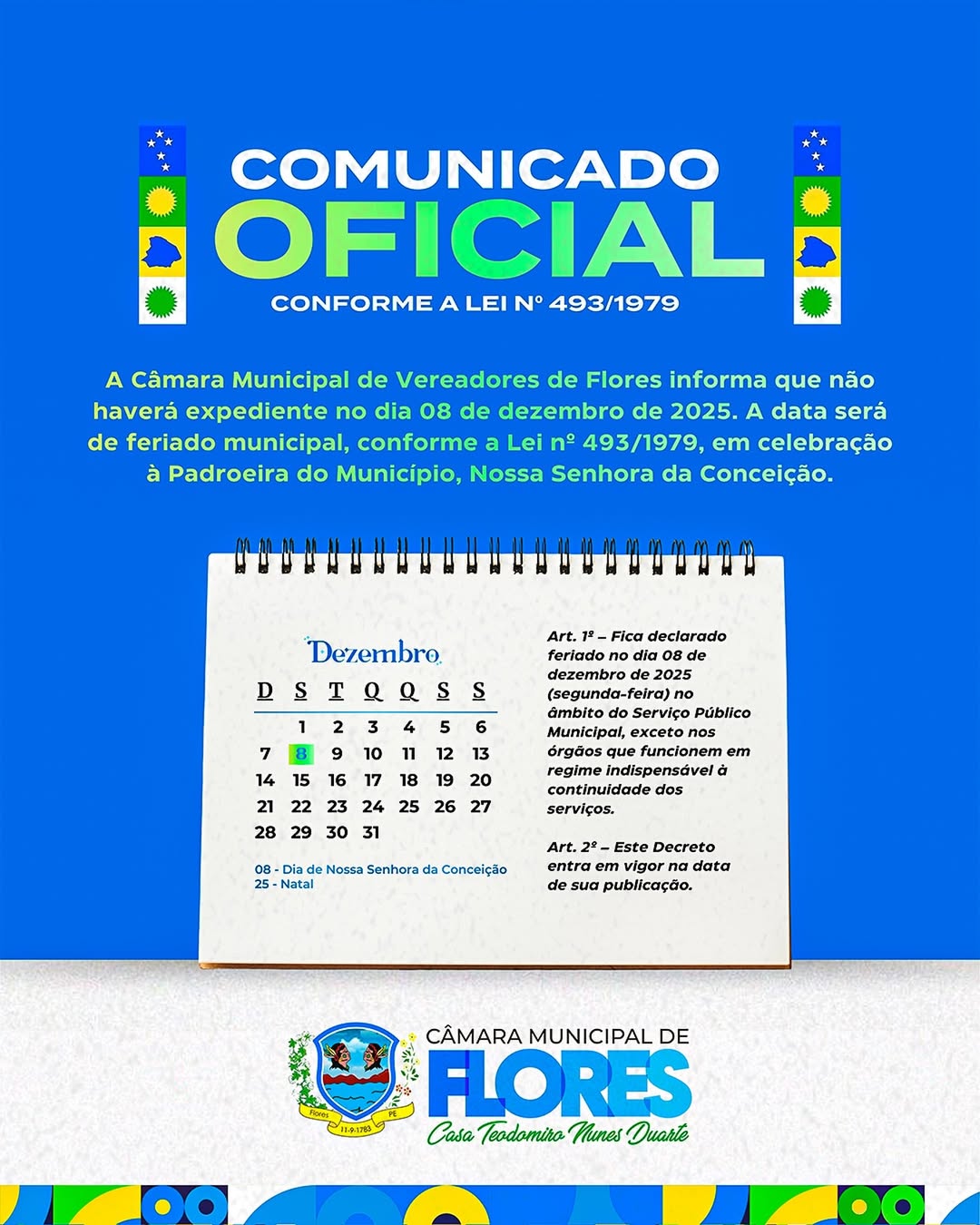 A Câmara Municipal de Vereadores de Flores informa que não haverá expediente no dia 08 de dezembro de 2025, em razão do feriado municipal instituído pela Lei nº 493/1979, que celebra a Padroeira do nosso município, Nossa Senhora da Conceição. Desejamos a todos um dia de reflexão, fé e celebração. Seguimos trabalhando com compromisso e