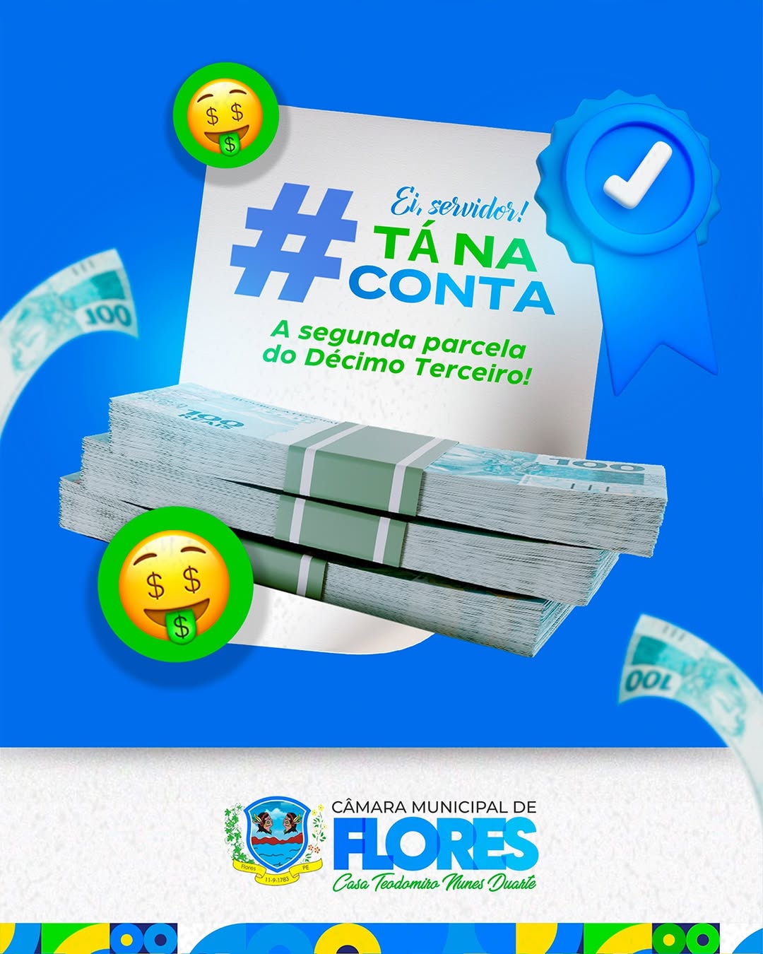 Boa notícia chegando para começar dezembro com o pé direito: a segunda parcela do Décimo Terceiro já tá na conta! 💸✨ É a Câmara Municipal de Flores seguindo firme no compromisso, valorizando quem faz a casa funcionar todos os dias. Pode conferir, pode comemorar… porque o sorriso hoje é garantido! 😄💰 #TáNaConta #ValorizaçãoDoServidor #CâmaraDeFlores #CompromissoComVocê
