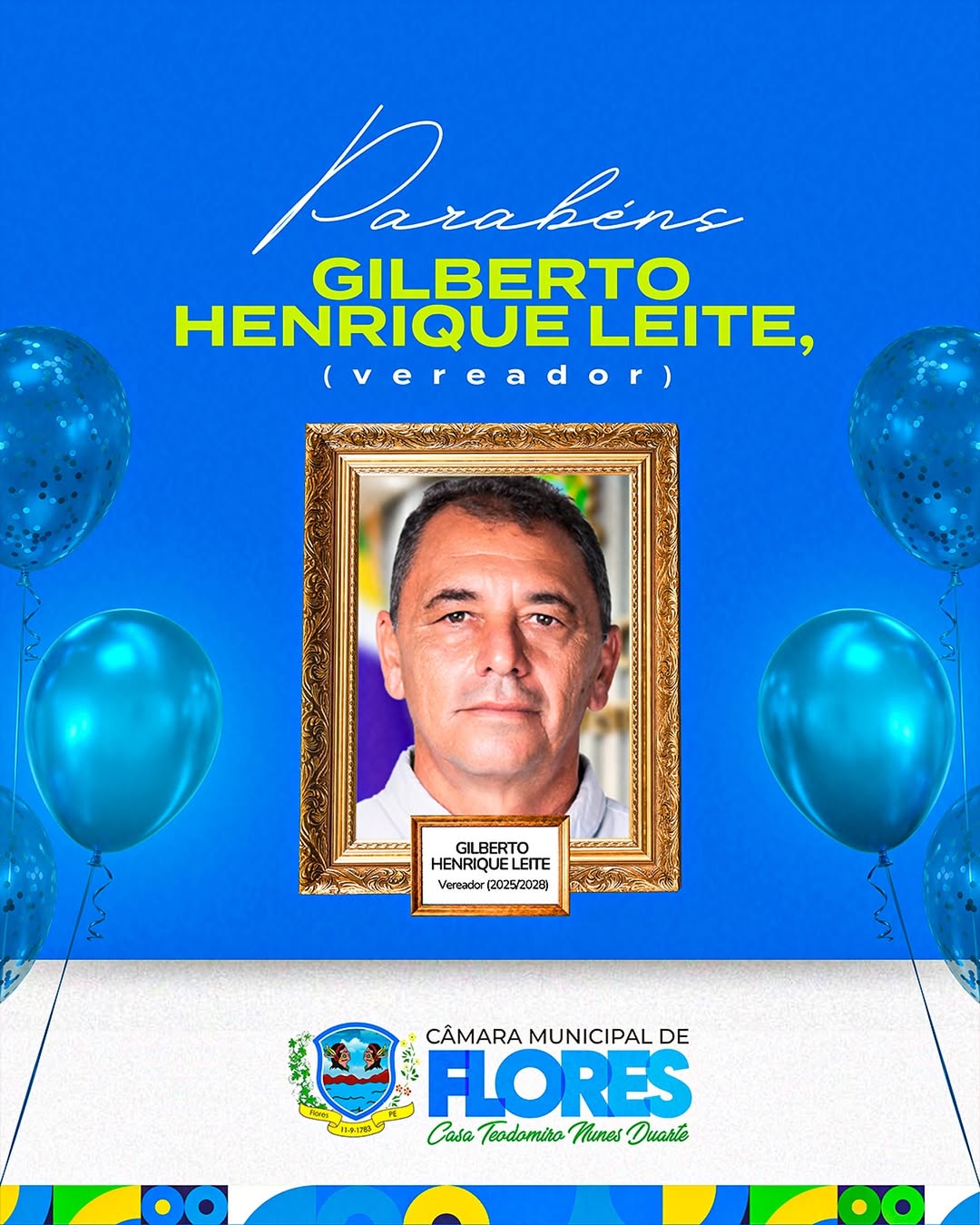 Hoje celebramos o aniversário do vereador Gilberto Henrique Leite. 🎉💙 A Câmara Municipal reafirma seu respeito e agradecimento pelo trabalho desempenhado e deseja muita saúde, sabedoria e conquistas neste novo ciclo. Parabéns, vereador! 👏🥳 #CâmaraDeFlores #Aniversário #Vereador #Parabéns #FloresPE