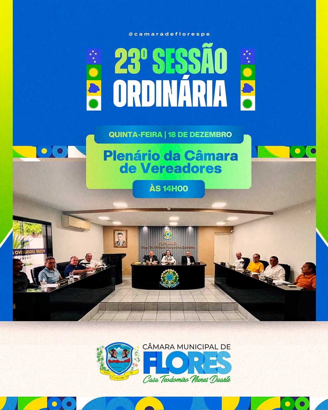 A Câmara Municipal de Flores convida toda a população para acompanhar a 23ª Sessão Ordinária, que será realizada nesta quinta-feira, 18 de dezembro, no Plenário da Câmara de Vereadores, com início às 14h. Este é um momento fundamental para o fortalecimento da democracia, onde são debatidas matérias de interesse coletivo, apresentadas proposições, discutidas demandas da