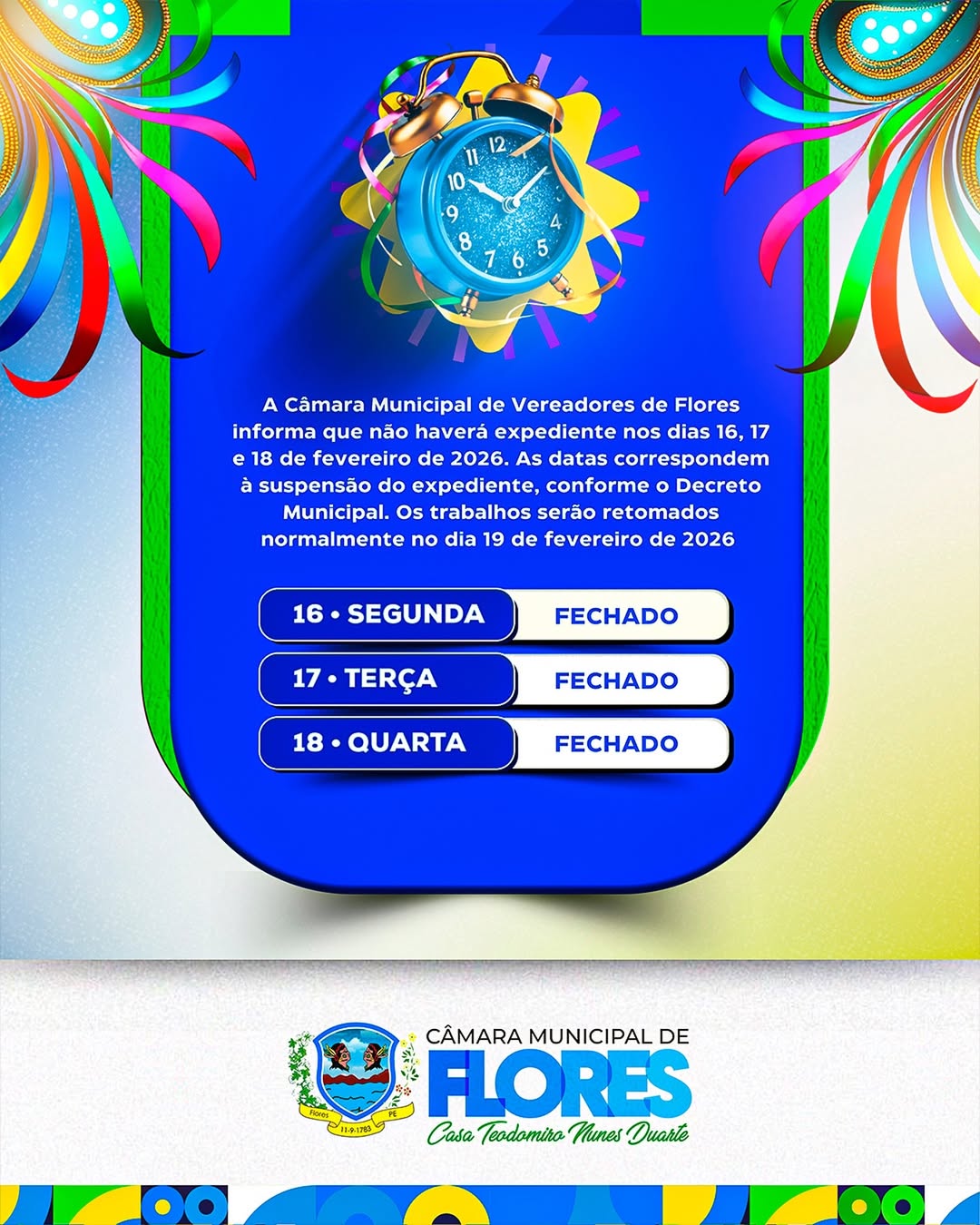 A Câmara Municipal de Vereadores de Flores informa à população que não haverá expediente nos dias 16, 17 e 18 de fevereiro de 2026