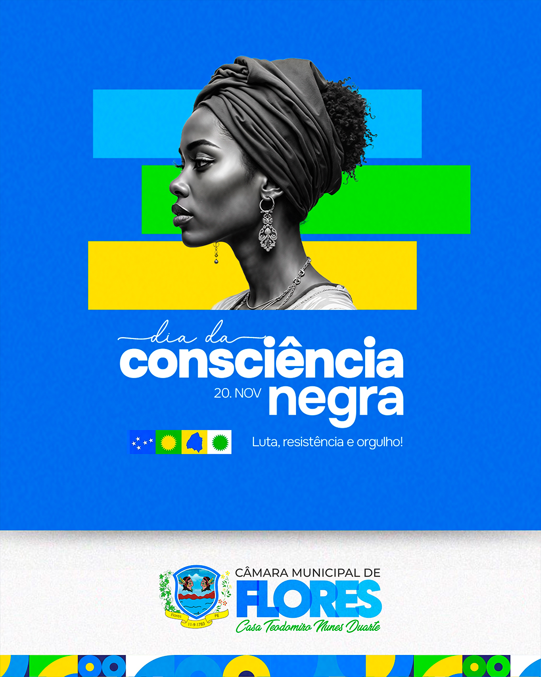 20 de novembro — Dia da Consciência Negra. Uma data para reforçar a luta, reconhecer a resistência e celebrar o orgulho do povo negro. A Câmara Municipal de Flores reafirma seu compromisso com a igualdade, o respeito e a valorização da história e da cultura afro-brasileira.