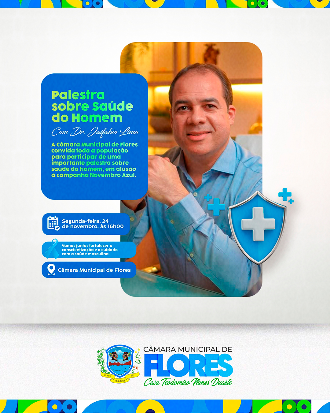 💙 Cuidar da saúde também é um ato de coragem. Convidamos todos para participar de uma palestra especial sobre Saúde do Homem, ministrada pelo Dr. Jaifabio Lima, em alusão ao Novembro Azul. Será um momento de informação, acolhimento e conscientização sobre a importância da prevenção, do diagnóstico precoce e do cuidado contínuo com a saúde