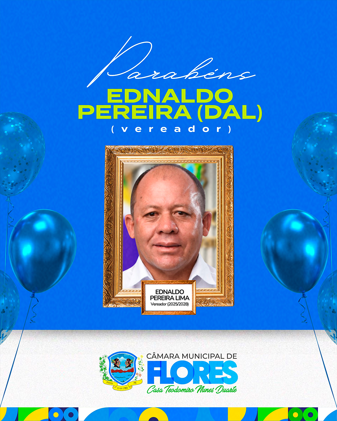 🎉 Parabéns, vereador Ednaldo Pereira (Dal)! A Câmara Municipal de Flores celebra hoje o aniversário de um representante da população. Que seu novo ciclo seja repleto de saúde, conquistas e muito êxito em sua missão pública! 👏💙