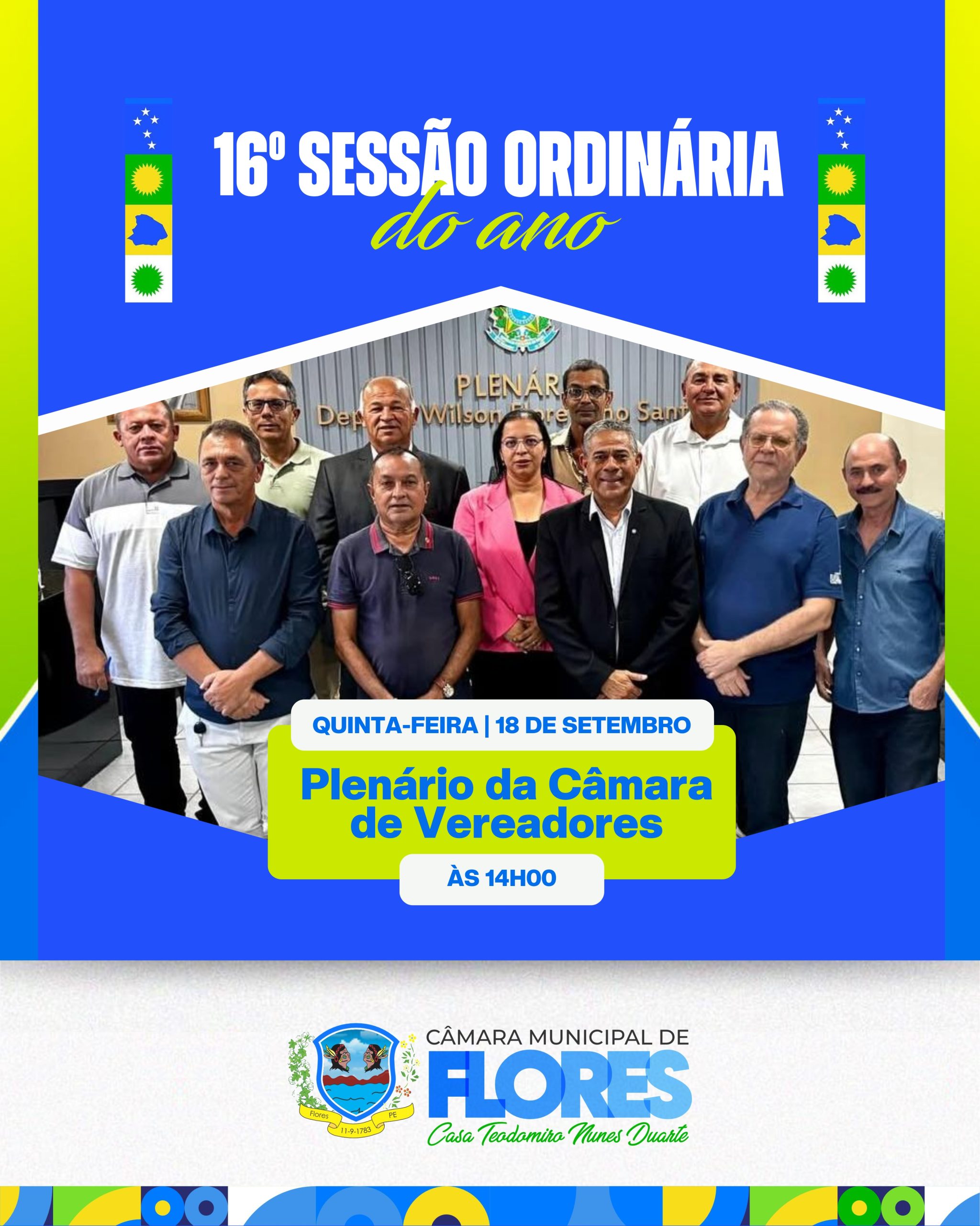 📌 Nesta quinta-feira, 18 de setembro, às 14h, acontece a 16ª Sessão Ordinária do Ano no Plenário da Câmara de Vereadores de Flores. Um momento importante para acompanhar de perto os debates e decisões que contribuem para o desenvolvimento do nosso município. 💙💚 ➡️ A população está convidada a participar! #CâmaraDeFlores #SessãoOrdinária #PoderLegislativo #FloresPE #ParticipaçãoPopular